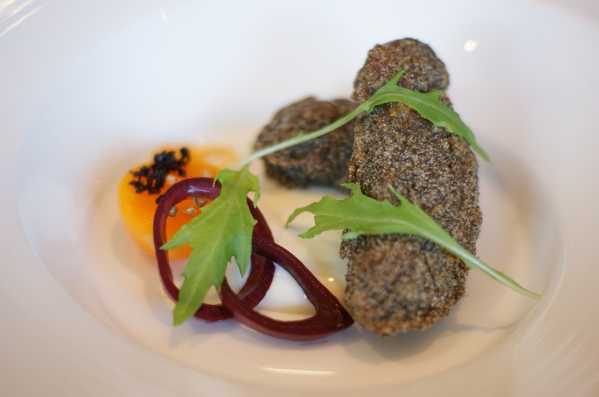 横に添えてあるのは卵の黄身とマヨネーズ、そして酢漬けにしたエシャロット。これを混ぜるとタルタルソースの味わい。