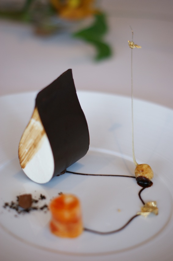 チョコレートの器の中にチョコレートのムースが2層になって入っています。
