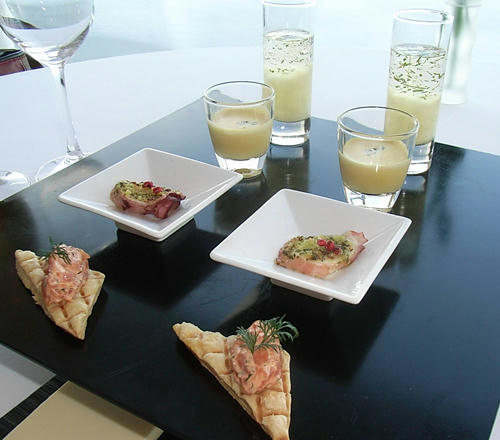 手前からサーモンのタルタル。パイに乗ってます。タコの香草パン粉焼き。カボチャのスープ、モヒート風ジュレ。