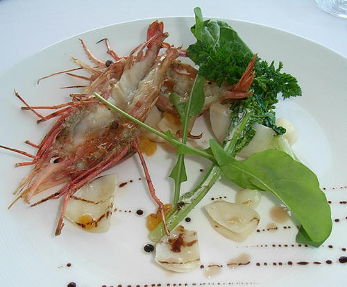 前菜。ボタン海老のソテーと真狩産ゆり根。