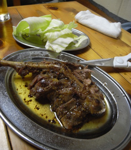 店によって、違いがありそうですが、骨付きのもも肉をオーブンなどで焼いたもの。