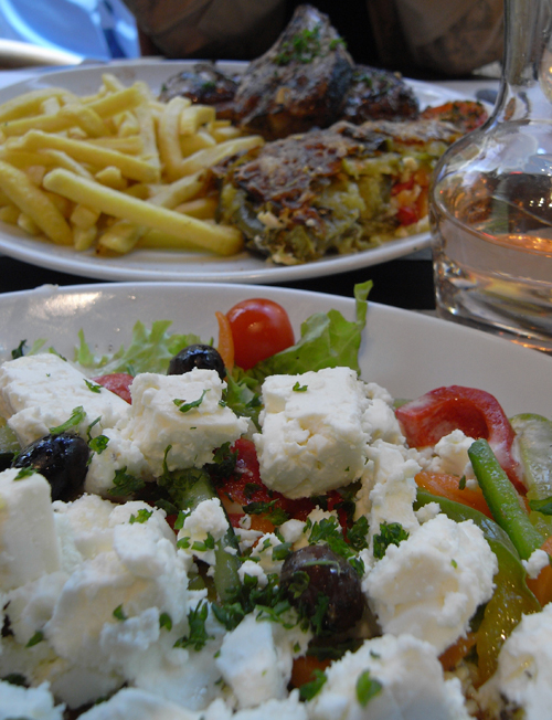 奥の皿は子羊のローストとフライドポテト&野菜のオムレツのような付け合わせ。