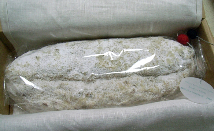 アーモンドを使った生地にドライフルーツとスパイスを入れて焼き、バターをたっぷりとしみ込ませて、そのあとまたたっぷりの粉砂糖をふって出来上がりです。