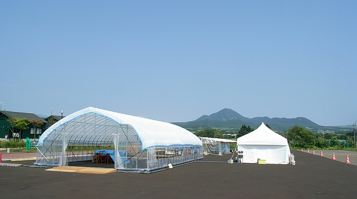 手前のピニールハウスはレストラン、その横の横幕も張ってあるテントが厨房。