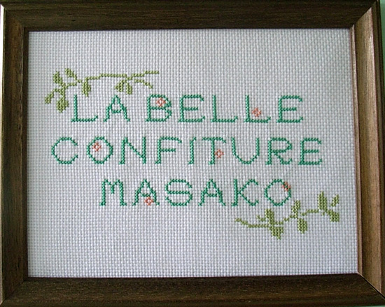 彼女が刺繍したもので(クロスステッチです)、優しい色合いと字体で作ってくれました。