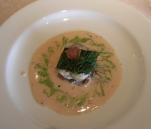 こちらはアンコウ。桜の塩漬けと合わせています。